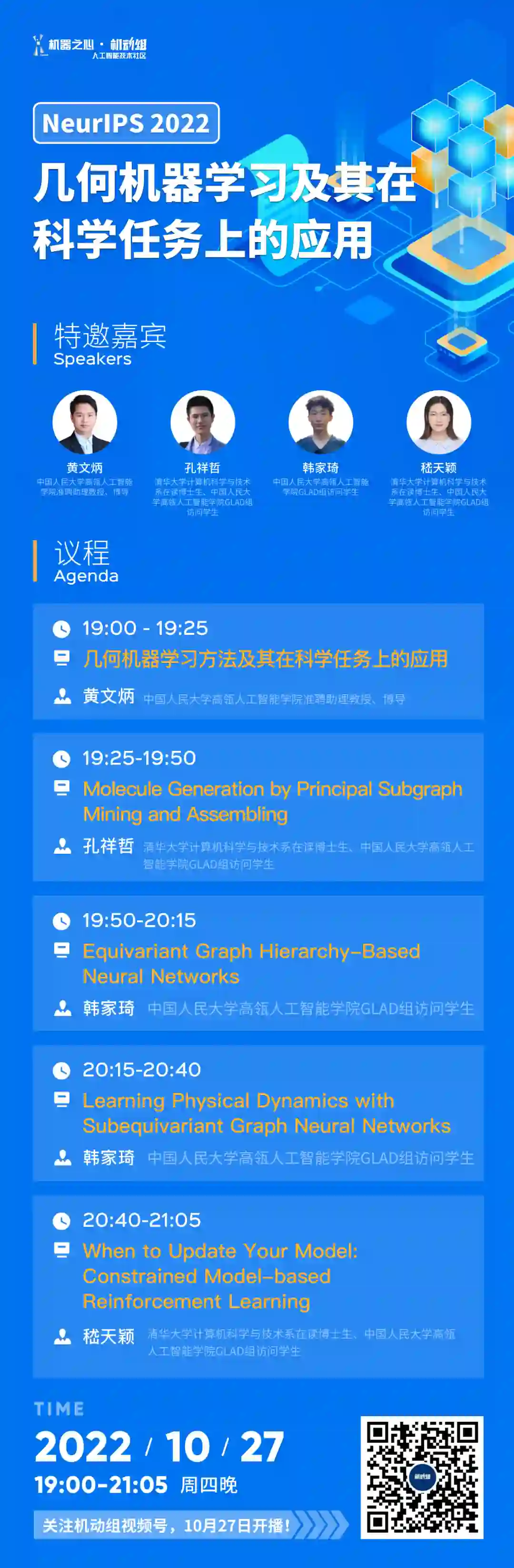 届时,中国人民大学高瓴人工智能学院准聘助理教授、博导黄文炳将首先进行主题为《几何机器学习方法及其在科学任务上的应用》的精彩分享,然后四篇论文作者将分别介绍不同技术在具体科学任务上的应用表现。