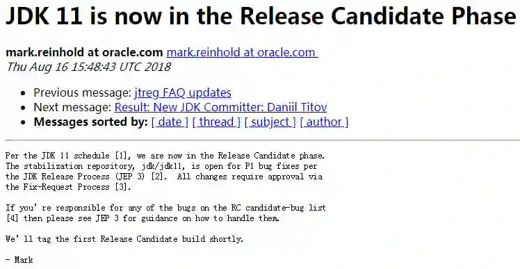 稳定仓库 jdk/jdk11 目前是开放的,可用于 P1-P2 错误修复,并在经过批准后,可根据 JDK Release Process (JEP 3),进入 late enhancements 阶段。