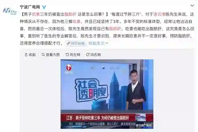 “纯素食者需要分解脂肪组织来维持营养均衡。大量脂肪酸从脂肪组织中释放进入肝脏,而这种脂肪在肝脏中不易被分解,如果不能及时排出,肝脏中的脂肪堆积过多,长此以往,就形成脂肪肝。”(来源:现代快报、宁波广电网)