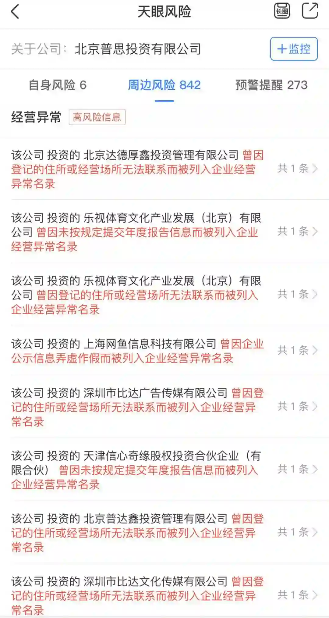 北京达德厚鑫投资管理有限公司、深圳比达公告传媒有限公司、北京普达鑫投资管理有限公司、深圳市比达文化传媒有限公司,均曾因登记的住所或经营场所无法联系而被列入企业经营异常名录;上海网鱼信息科技有限公司曾因公示信息弄虚作假而被列入企业经营异常名录。