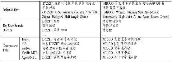 在淘宝、天猫等电商平台,商家为了搜索引擎优化(SEO),撰写的商品标题通常比较冗余,尤其是在APP端等展示空间有限的场景下,过长的商品标题往往不能完全显示,只能进行截断处理,严重影响用户体验。如何将原始商品标题压缩到限定长度内,而不影响整体成交是一个极具挑战的任务。