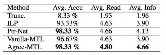 我们使用了淘宝女装类目下的商品标题数据进行了实验,对比了五种不同的文本摘要方法。第一种是baseline方法,根据目标长度直接截断方法(Trunc.);第二种是经典的整数线性规划方法(ILP),需要对标题进行分词、NER、TermWeighting等预处理;第三种是基于Pointer Network实验的encoder-decoder抽取式方法(Ptr-Net);第四种是多任务学习方法,直接将两个子任务的损失函数相加作为整体损失函数进行优化(Vanilla-MTL);第五种是本文提出的考虑Attention分布一致性的多任务学习方法(Agree-MTL)。
