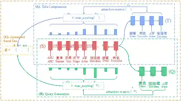 该方法同时进行两个Sequence-to-Sequence学习任务:主任务基于Pointer Network模型实现从原始标题到短标题的抽取式摘要生成,辅任务基于带有注意力机制的encoder-decoder模型实现从原始标题生成对应商品的用户搜索query。两个任务之间共享网络编码参数,训练过程中对两者在原始标题上的注意力分布进行联合优化, 使得两个任务对于原始标题中重要信息的关注尽可能一致。