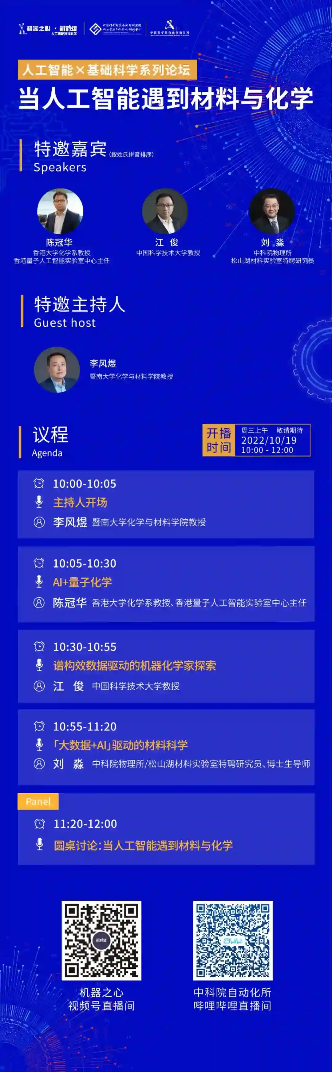 10月19日10:00-12:00,机器之心、中科院自动化所与中科院香港创新研究院人工智能与机器人创新中心联合举办系列论坛第四期,以「当人工智能遇到材料与化学」为主题,特邀暨南大学化学与材料学院教授李风煜主持,多位领域专家做技术分享,聚焦材料与化学领域的人工智能应用。