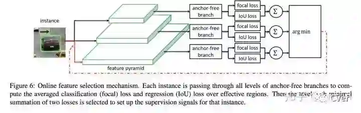 文章提出FSAF模块让每个instance自动的选择最合适的feature,在这个模块中,anchor box的大小不再决定选择哪些feature进行预测,也就是说anchor (instance) size成为了一个无关的变量,这也就是anchor-free的由来。因此,feature 选择的依据有原来的instance size变成了instance content,实现了模型自动化学习选择feature。