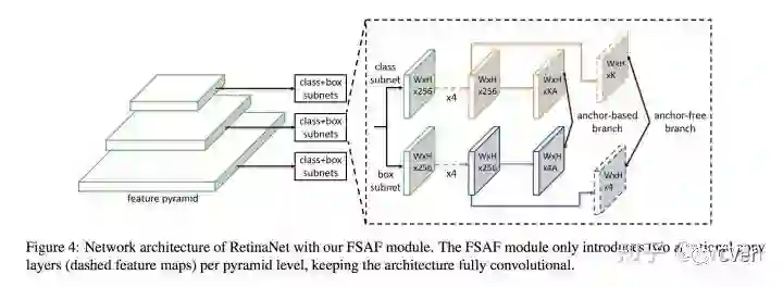 先来看看FSAF的结构。文章提出的FSAF以RetinaNet为主要结构,添加一个FSAF分支和原来的classification subnet、regression subnet并行,可以不改变原有结构的基础上实现完全的end-to-end training,特别是,FSAF还可以集成到其他single-stage模型中,比如SSD、DSSD等。