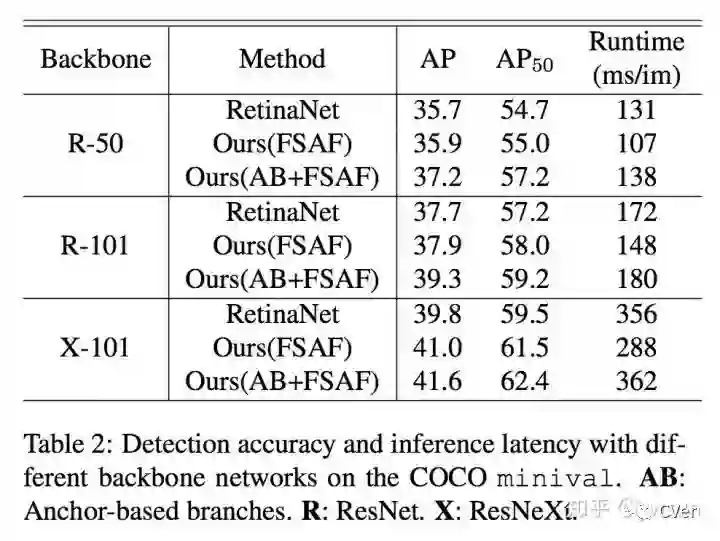 作者在ablation study部分分析了anchor-free的必要性,online feature selection的重要性,以及选择的feature level是不是最优的。同时还指出FSAF非常robust和efficient,在多种backbone条件下,都有稳定的涨点。在ResNext-101中,FSAF超过anchor-based1.2个点,同时快了68ms,在AB+FSAF情况下,超过RetinaNet1.8个点,只慢了6ms,效果也是非常显著的。