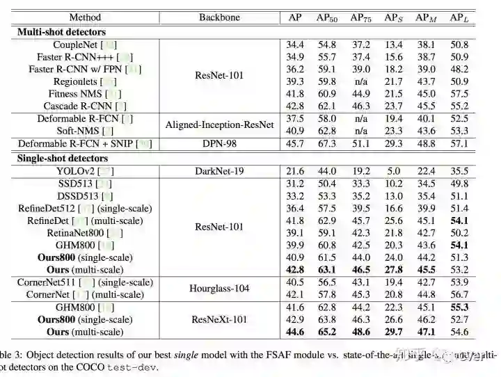 值得注意的是,FSAF模块没有了anchor scale、aspect ratio等概念,是一个anchor-free的检测方法(和CornerNet不同)。