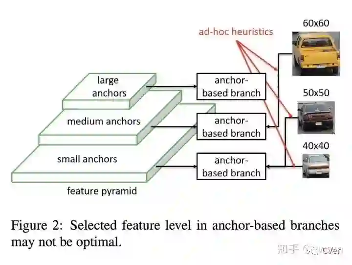 在single-stage模型中,我们会定义一系列稠密的均匀分布的anchor,这些anchor会根据其不同的尺寸大小和不同的feature map联系起来。在带有FPN的backbone中,高层的feature map分辨率高,得到的anchor数量多尺寸小,浅层的feature map分辨率低,得到的anchor数量少尺寸大,anchor的生成是根据feature map不同而定义的。在anchor match gt阶段,gt与anchor匹配,确定gt归属于哪些anchor,这个过程隐式的决定了gt会由哪层feature map负责预测。不管是生成anchor还是gt match 过程,都是由size这个变量决定,虽然我们会设定先验的规则来选择最好的feature map,但存在的问题是,仅仅利用size来决定哪些feature map来检测物体是一种暴力的做法。如下图所示,60x60大小的car和50x50大小的car被分在了不同feature map,50x50和40x40的被分在了同一级feature map,谁也不能证明这种做法不好,但谁也不能证明这种做法就是最好,那么何不让模型自动学习选择合适的feature 去做预测呢?