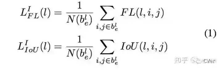 box regression output是一个WxHx4大小的feature map,那么在坐标为(i,j)的点上是一个长度为4的向量,分别表示4个偏移量。假设一个instance,其在feature level为 对应的有效区域,这个instance会影响内的每个值。假设坐标为(i,j),长度为4的向量 表示这个instance的上、左、下、右4边界和(i,j)的距离,然作为最后输出结果。分支采用IoU Loss,整个regression loss是一张图片中每个有效区域的IoI Loss的均值。