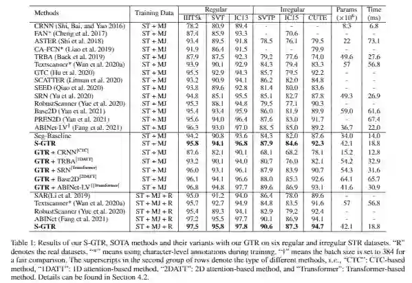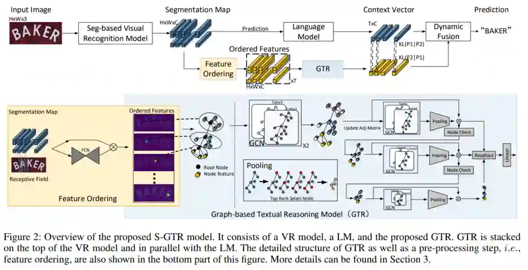 论文概述: 现有的场景文本识别(STR)方法通常使用语言模型来优化视觉识别(VR)模型预测的一维字符序列的联合概率, 然而忽略了字符实例内部和字符实例之间的二维空间视觉语义,使得这些方法不能很好地应用泛化到任意形状的场景文本。为了解决这个问题,本文中首次尝试利用视觉语义进行文本推理。具体而言,在给定 VR 模型预测的字符分割图,首先为每个字符实例构建一个子图,并通过根节点顺序连接合并成一个完整的图。其次基于该图,我们设计了一个图卷积网络(GTR)进行视觉文本推理。同时我们将GTR 和语言模型结构并行构建S-GTR,通过相互学习有效地利用视觉语言互补性。另外GTR 可以插入不同的STR 模型以提高其识别性能。实验证明了所提方法的有效性,S-GTR 在六个通用场景文字识别数据集上获得较好表现,并可以推广到多语言数据集。