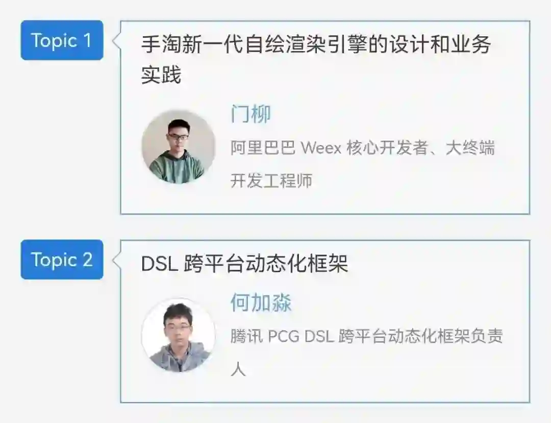 目前专题已确认两个议题,分别是 Weex2.0(是的,你没看错,Weex 今年将推出 2.0 版本,这一版本他们内部打磨了很久,是真的带着诚意来的),和来自腾讯 PCG 的 DSL 跨平台动态化方案(探讨差异化的应用,在不同场景下如何解决不同的问题)。