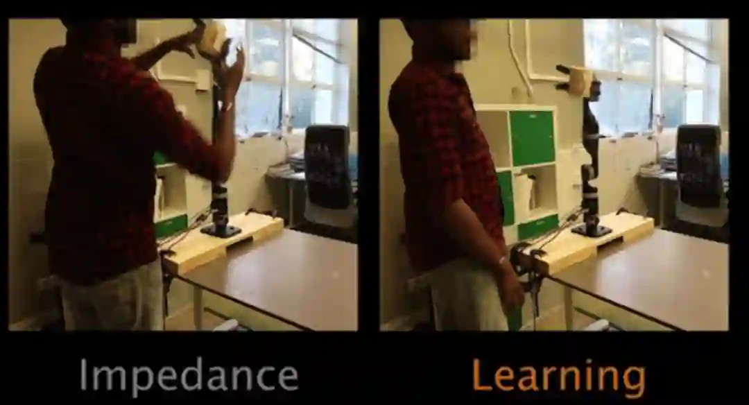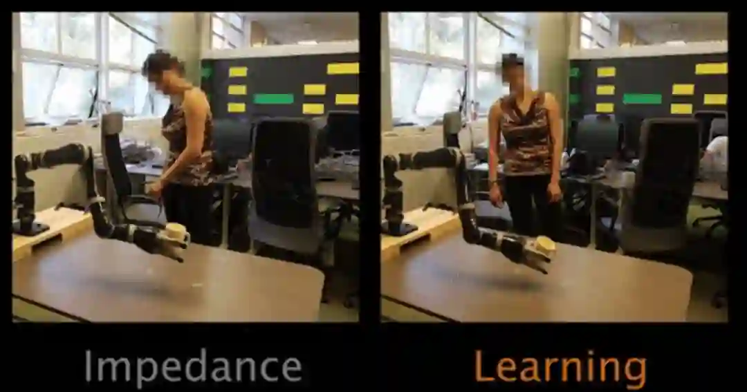 物理人机交互(pHRI)领域研究的是共享工作空间里亲密的物理交互中出现的设计、控制和规划问题。之前的 pHRI 研究已经开发出了应对机器人在执行任务时面对物理交互的应对方法。由 Hogan(http://summerschool.stiff-project.org/fileadmin/pdf/Hog1985.pdf)等人提出的阻抗控制是常用的方法之一,阻抗控制可以让机器人在有人存在的空间里朝着期望的轨迹移动。使用这个控制方法时,机器人就像一个弹簧一样:它允许人推它,但是在人停止施力之后,它会移回到原来的期望位置。尽管这种策略非常快速,并且能够让机器人安全地适应人类的力量,但是机器人并不会利用这种干预去更新它对任务的理解,机器人将继续以与人类交互之前规划好的方式执行任务。