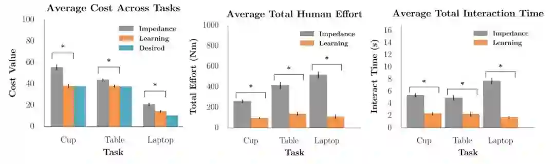 图 3 . 对于每一个目标测量(包括任务代价、人类努力以及交互时间),从交互中学习显著地优于不进行学习的情况。
