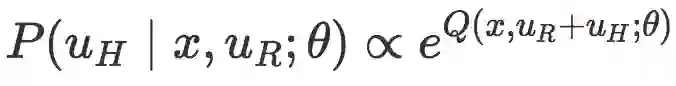 正如我们讨论的,机器人应该观察人类的动作来推理位置的任务目标。为了把机器人测量的直接人力与目标函数联系起来,机器人采用了观测模型。在最大熵逆强化学习(IRL)(https://www.aaai.org/Papers/AAAI/2008/AAAI08-227.pdf)中的现有工作和人类行为认知科学模型(http://web.mit.edu/clbaker/www/papers/cogsci2007.pdf)中的玻尔兹曼分布的基础上,我们将人类的干预建模为:机器人在处于状态 x 并采取 uR+uH 的行动时,能够将机器人期望的奖励近似最大化的矫正。这个期望的奖励包含即时奖励和未来奖励,并且由 Q 值描述。