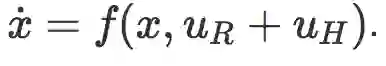 我们将会集中讨论这种方法的两个部分:(1)目标函数的结构;(2)机器人通过给定的人类物理交互推理目标函数的观察模型。让 x 代表机器人的状态(例如位置和速度),uR 代表机器人的动作(例如施加到关节的扭矩)。人类可以通过外部的力矩来与机器人产生物理交互,称作 uH,机器人通过它的动力运动到下一个状态。
