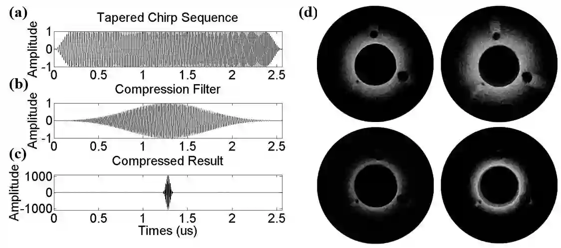 图2.(a-c)编码成像原理示意图;(d)编码成像技术可以大幅度提高血管内超声成像的穿透深度