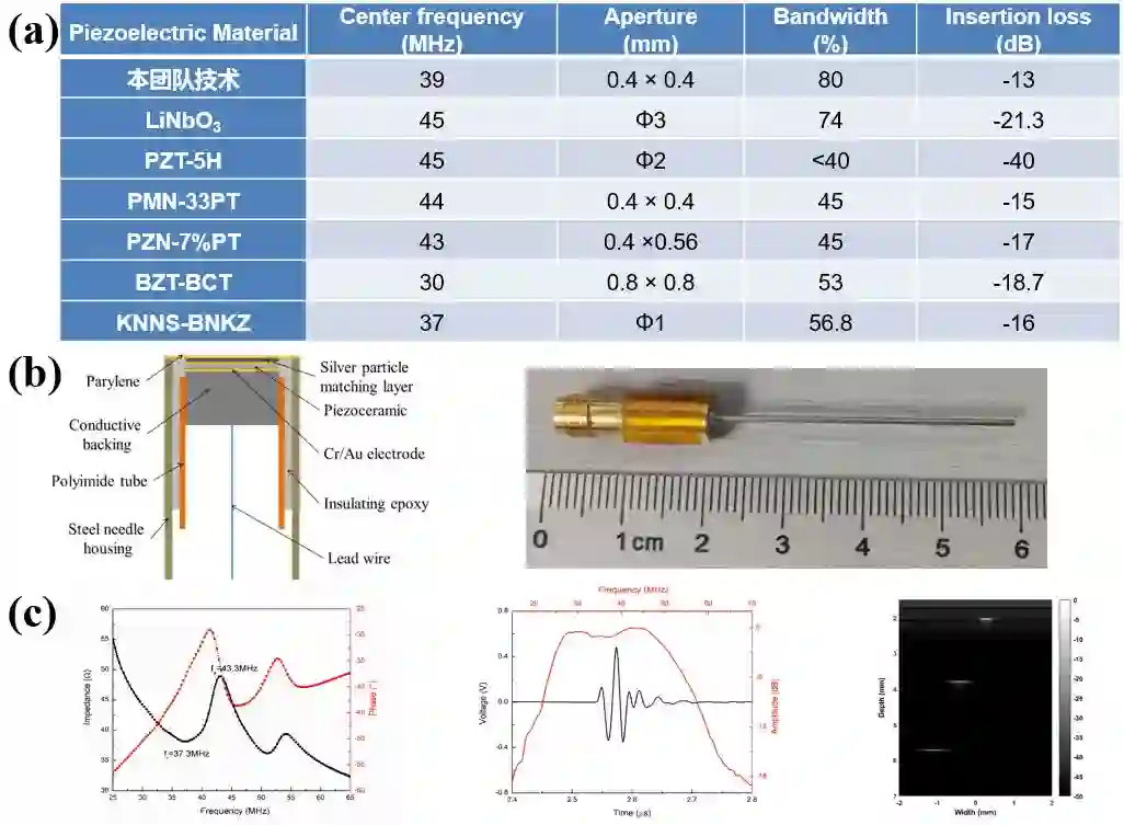 图1.(a)高频超声换能器技术参数对比;(b)高频超声换能器结构示意图和实物图;(c)成像性能测试图