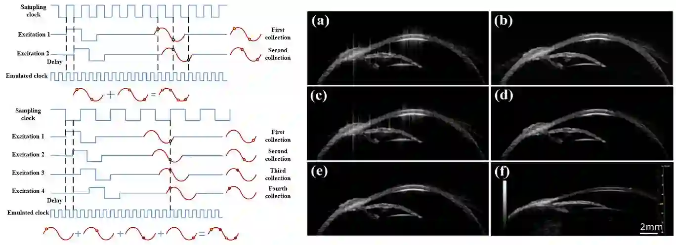 图3.左:延迟激励成像原理示意图;右:眼睛组织超声成像图