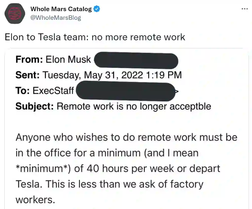 说来,马斯克早就对远程办公政策嗤之以鼻,他今年早些时候就曾表示: