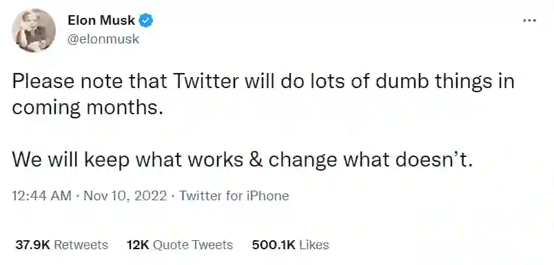 在周三的一条推文中,马斯克承认Twitter的新功能还处于试错期: