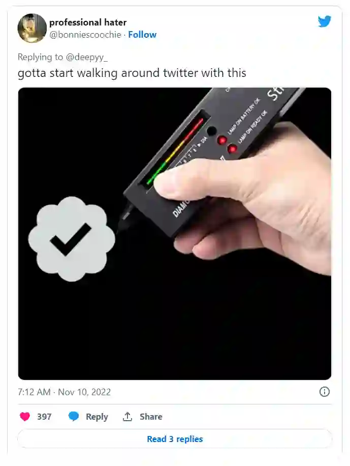 还有人分享了一张钻石测试的照片,而待检测的正是Twitter的「蓝V」标,意思显然是:这东西是经不起检验的。