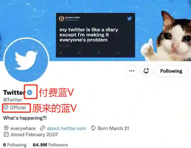 更有趣的是,「付费蓝V」还是带有免责声明的!它的大致意思是「此帐户已通过验证,因为它订阅了Twitter Blue」,而机构、组织们的声明则是「此帐户已通过验证,因为它在政府、新闻、娱乐或其他指定类别中引人注目」。