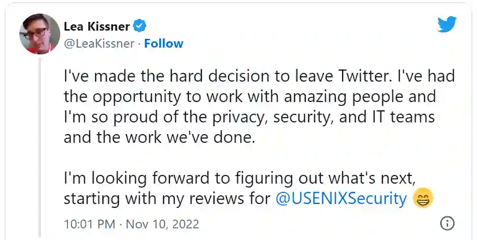 其中包括首席信息安全官 Lea Kissner,他在周四早些时候宣布将离开公司。另外,Twitter 的广告销售主管 Robin Wheeler 和信任与安全主管 Yoel Roth 也宣布走人。