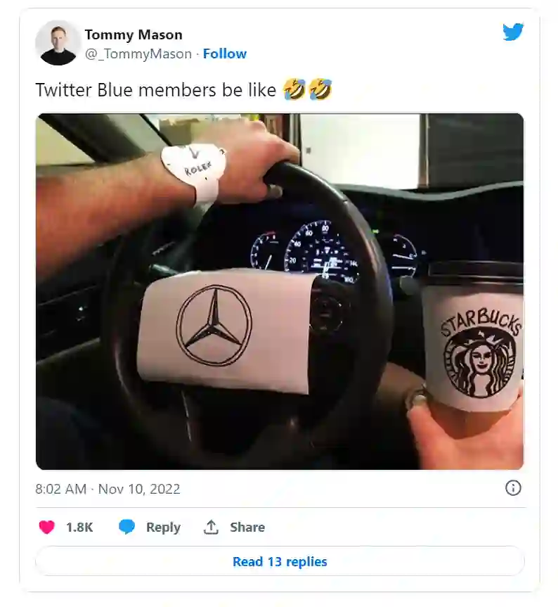 产品设计师Tommy Mason发布了一张贴有纸片制成的「劳力士」、「奔驰」和「星巴克」logo的开车图片,以此调侃新「蓝V」是有名无实的鸡肋。