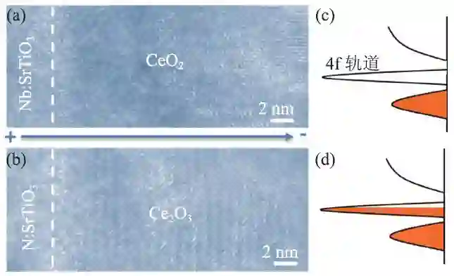 图6 CeO2中氧离子在电场作用下的迁移[43] (a,b)CeO2与Ce2O3高分辨TEM 图片;(c,d)CeO2与Ce2O3对应的能带结构示意图。CeO2中的氧离子在电场作用下迁移,引起CeO2到Ce2O3的结构转变