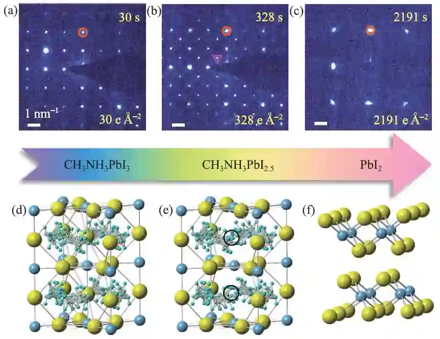 由于钙钛矿材料对电子束十分敏感,其原子成像充满挑战[57]。因此,研究者们多采用电子束剂量相对较弱的电子衍射模式用于判定钙钛矿的结晶性以及相成分。图7所示为通过连续电子衍射图谱的变化研究了MAPbI3 在电子束辐照下的分解路径[58]。当电子束剂量率控制在1 e Å-2 s-1时,首先可以采集到原始的钙钛矿的电子衍射图(图7(a)),当剂量逐渐增加到328 e Å-2时,电子衍射图中含有大量超结构衍射点,对应着超结构相的生成(图7(b)),最终当剂量增加到2191 e Å-2,结构完全分解成碘化铅(图7(c))。考虑到碘离子在MAPbI3中扩散势垒较低,容易发生迁移,根据电子衍射,可推断超结构相的产生很可能是由有序碘空位的形成引起的,如图7(d,e)所示。