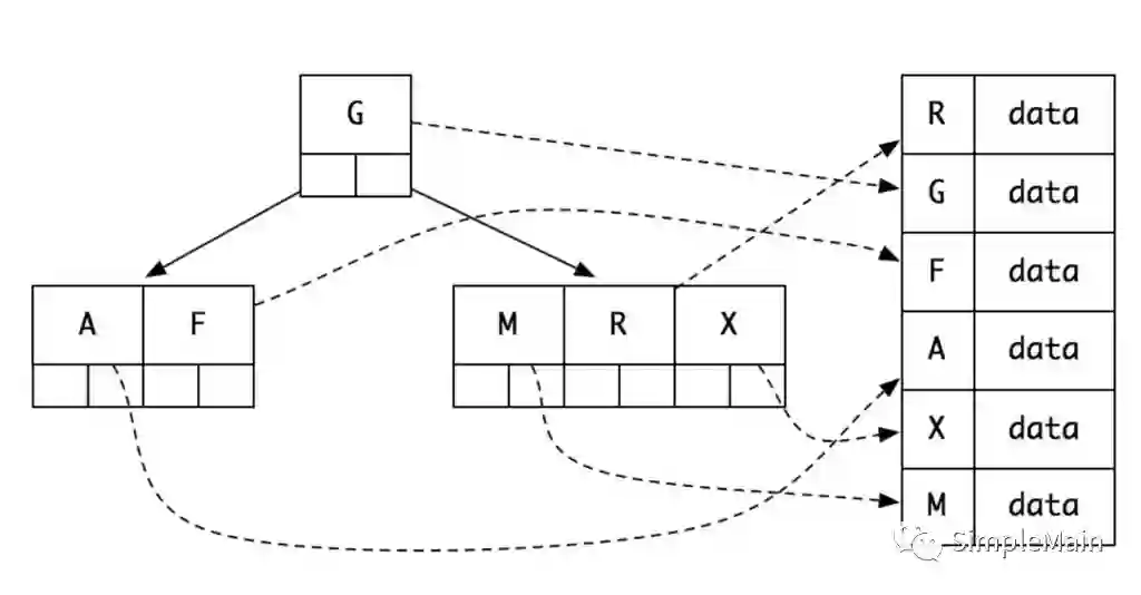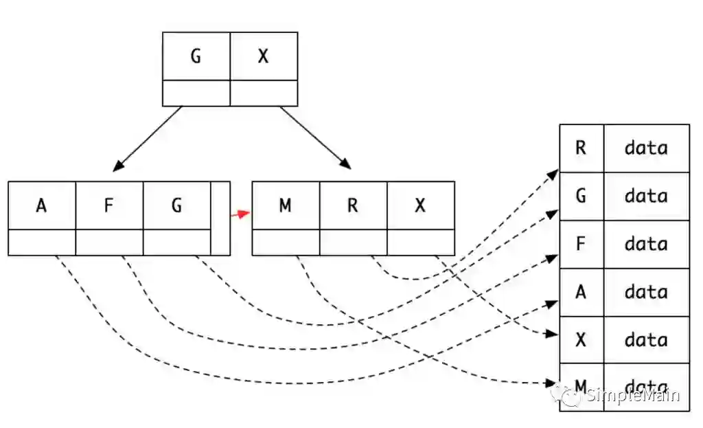 2、大家注意看那个红色的箭头,每个叶结点都有指向下一个叶结点的链接。这样的好处在于,我们可以从任意一个叶结点开始遍历,获取接下来所有的数据。