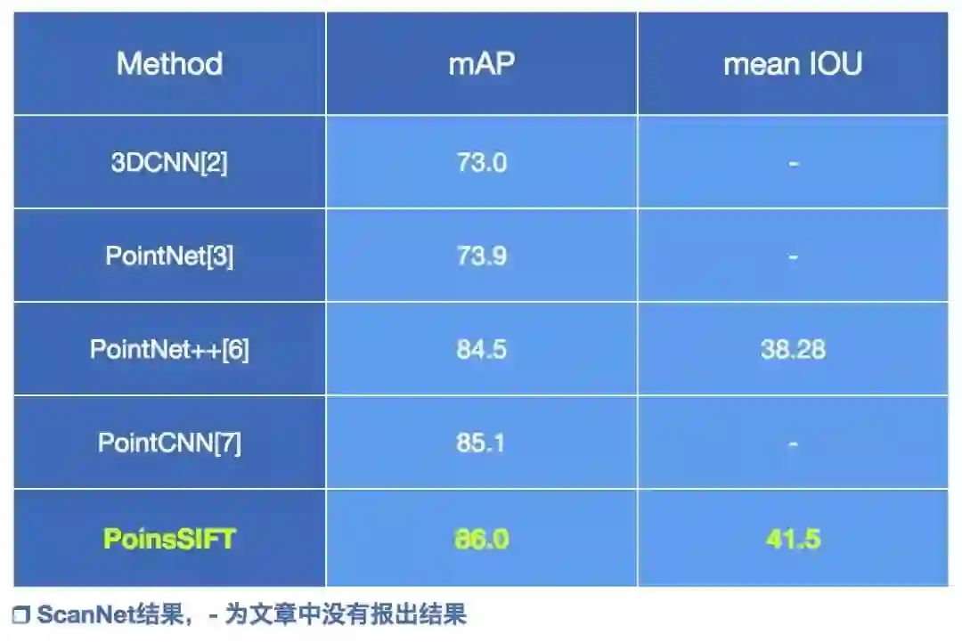 上海交通大学卢策吾团队 MVIG 实验室最近开源了 PointSIFT,这是一个点云特征的提取模块。在 Stanford Large-Scale 3D Indoor Spaces(S3DIS) [1] 中可以达到 70.23 的 mIoU(对比 PointCNN 62.74, 相对提高 11.9%)。在另一个常用数据集Stanford ScanNet [2]上可以达到 41.50 的 mIoU(对比 PointNet++ 38.28, 相对提高 8.1%)。