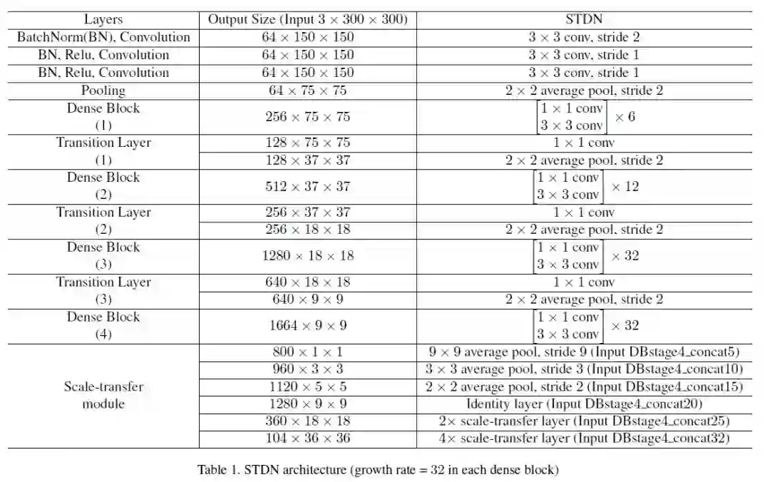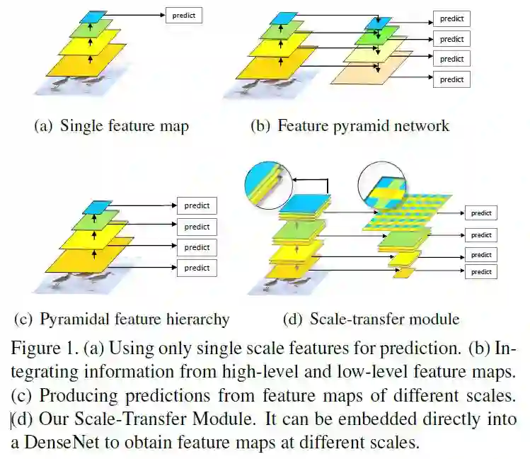 为了获得具有高水平语义信息的多尺度特征图,并且不损失检测器的速度,作者提出了一个Scale-Transfer Module (STM),并将这个模块直接嵌入到DenseNet中,DenseNet可以整合低层高层信息,以此得到更强有力的特征表示。STM包括pooling层和scale-transfer层,pooling层用来降低特征图的分辨率,scale-transfer层用来扩张特征图的分辨率,而且不会带来额外的参数和计算量。