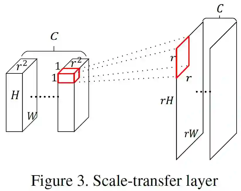原始的scale-transfer层是用来做超像素的,也有一些人将其用于语义分割,作者将其用于目标检测。因为卷积神经网络的conv和pooling层的存在,导致高层的特征图特别小,比如对于输入为300*300*3的图像,经过DenseNet-169以后,顶层的特征大小为9*9*1664,这意味着特征图中的一个像素大约对应着原图中的33个像素,如果使用4X scale-transfer层,那么9*9*1664的特征图的大小就变为了36*36*104,此时得到的anchor的数量是在原来特征图上得到anchor数量的16倍。而且,相比于其他的上采样操作,比如反卷积,该方法没有增加额外的参数和计算,另外由于该方法降低了通道的数量,能够有效的降低后续分类和box回归自网络的参数,这对于保证检测器的实时性是非常有益的。