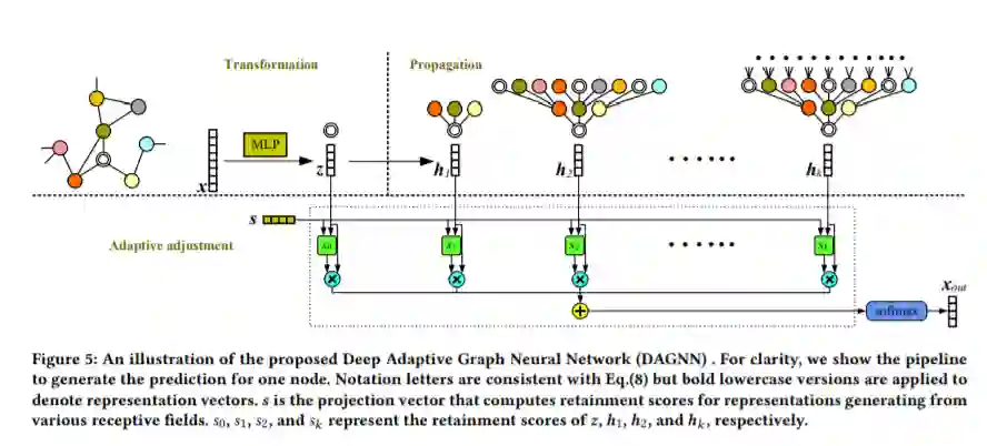 图神经网络在图表示学习领域取得了显著的成功。图卷积执行邻域聚合,并表示最重要的图运算之一。然而,这些邻域聚合方法的一层只考虑近邻,当进一步启用更大的接受域时,性能会下降。最近的一些研究将这种性能下降归因于过度平滑问题,即重复传播使得不同类的节点表示无法区分。在这项工作中,我们系统地研究这一观察结果,并对更深的图神经网络发展新的见解。本文首先对这一问题进行了系统的分析,认为当前图卷积运算中表示变换与传播的纠缠是影响算法性能的关键因素。将这两种操作解耦后,更深层次的图神经网络可用于从更大的接受域学习图节点表示。在建立深度模型时,我们进一步对上述观察结果进行了理论分析,这可以作为过度平滑问题的严格而温和的描述。在理论和实证分析的基础上,我们提出了深度自适应图神经网络(DAGNN),以自适应地吸收来自大接受域的信息。一组关于Citation、合著和共购数据集的实验证实了我们的分析和见解,并展示了我们提出的方法的优越性。