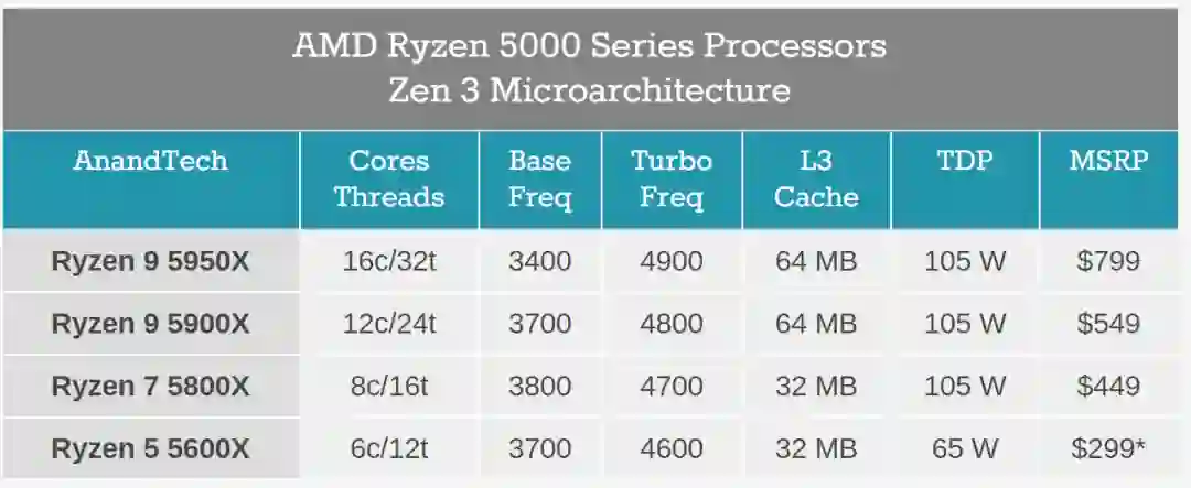在发布的全新处理器中,Ryzen 5900X、5800X 和 5600X 都比上一代的同类产品贵了 50 美元。