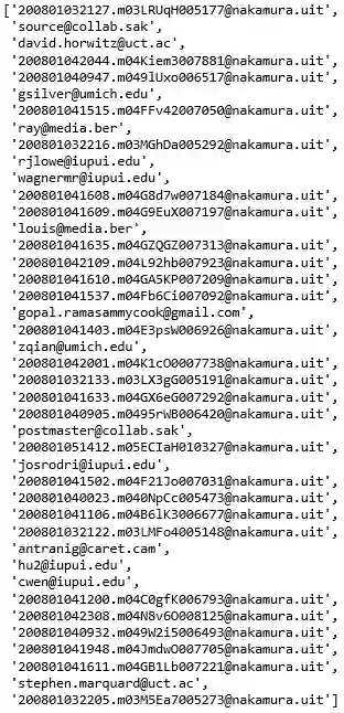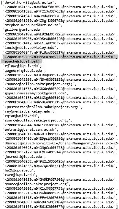 pat = r'\S+@\S+'obj = re.compile(pat)email_list = []hand = open('email.txt')for line in hand:line = line.rstrip()email_addr = obj.findall(line)if len(email_addr) > 0:email_list.append(email_addr[0])list(set(email_list))