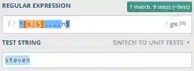 上面的 RE 定义的模式如下:任何 6 个字符的单词,以 s 开头 (^s 的效果),以 n 收尾 (n$ 的效果)。之所以是 6 个字符,是因为有 4 个点 (.) 加上 s 和 n 字符。用上面那个网站做验证,这个 RE ^s....n$ 的若干匹配结果如下:
