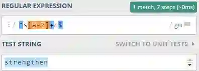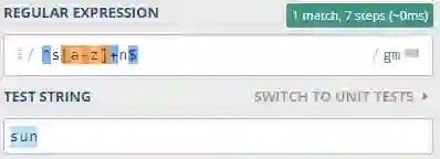 现在 sun 和 strengthen 都可以匹配出来了。起作用的是 [a-z]+,[a-z] 表示小写的字母 a 到 z 的集合,而 + 代表大于一次,联合在一起的意思就是该单词“以 s 开头,以 n 结尾,中间有大于一个的任何小写字母”。