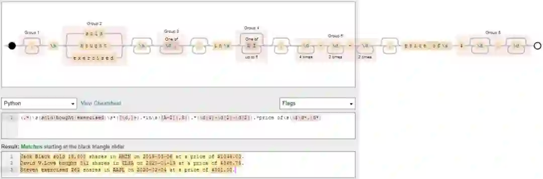 pat = r'([a-zA-Z. ]*)' \'\s(sold|bought|exercised)' \'\s*([\d,]+)' \'.*in\s([A-Z]{,5})' \'.*(\d{4}-\d{2}-\d{2})' \'.*price of\s(\$\d*.\d*)'re.findall( pat, news )
