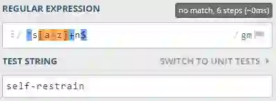 没关系,我们把 - 加入字母集合里,写成 [a-z-]+,注意第一个 - 表示从 a 到 z,第二个 - 表示短连接线。现在可以匹配 self-restrain 了。