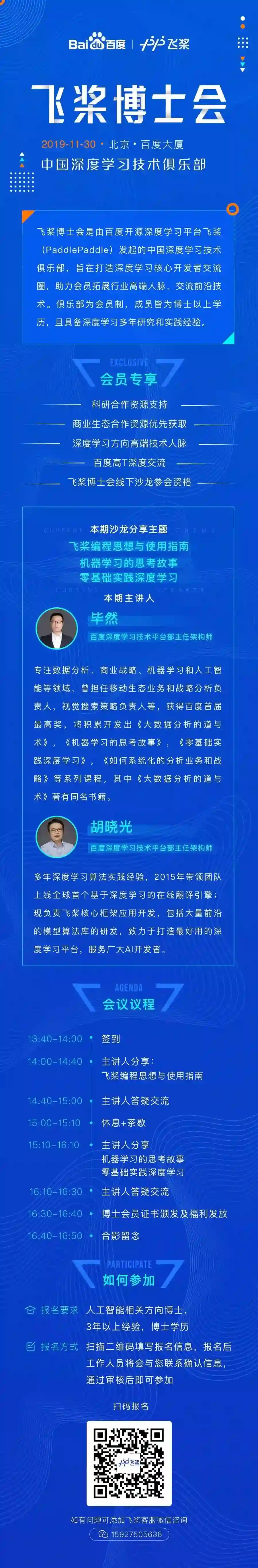 飞桨博士会是由百度开源深度学习平台飞桨(PaddlePaddle)发起的中国深度学习技术俱乐部,旨在打造深度学习核心开发者交流圈,助力会员拓展行业高端人脉、交流前沿技术。俱乐部为会员制,成员皆为博士以上学历,且具备深度学习多年研究和实践经验。博士会的会员将会获得以下优享机会: