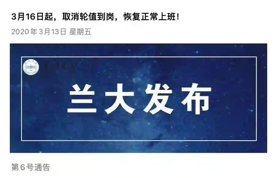 3月13日,兰州大学官微发布《关于取消轮值到岗 恢复正常上班的通知》,通知表示,