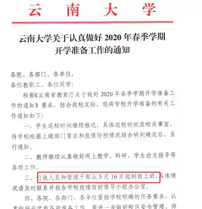 3月14日,云南大学官网发布了《云南大学关于认真做好2020年春季学期开学准备工作的通知》。