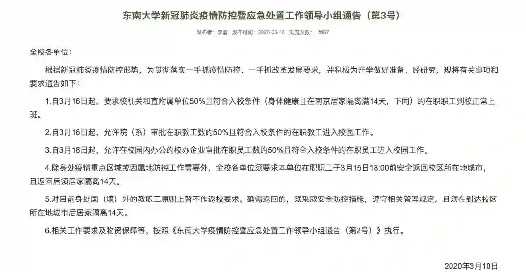 3月10日,东南大学官网发布了《东南大学新冠肺炎疫情防控暨应急处置工作领导小组通告(第3号)》。