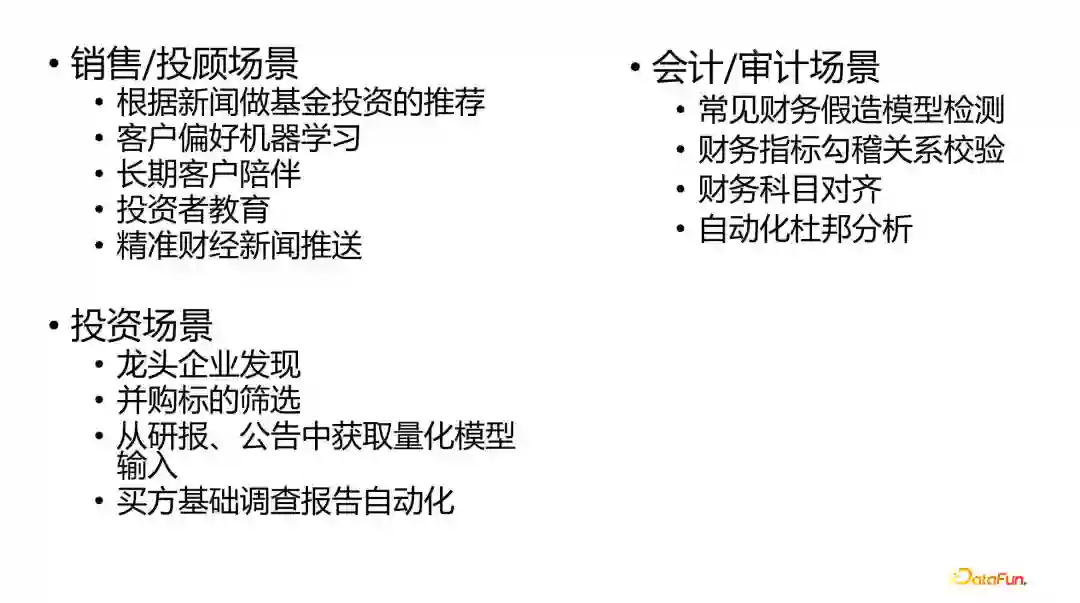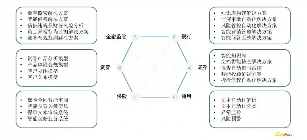 2018年随着整个国家金融转型,在监管、基础数据、资管、咨询、研究、销售、投顾、会计、审计、投资等10大应用领域新增非常多的细分场景,具体场景如下: