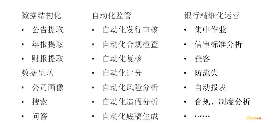 我们面临一些新的问题:数据结构化,数据如何呈现问题,还有各种细粒度的自动化监管问题。另外我们也开始发现了更多银行精细化运营的问题,包括集中作业问题、获客问题、客户防流失问题,所以很多细分场景如下: