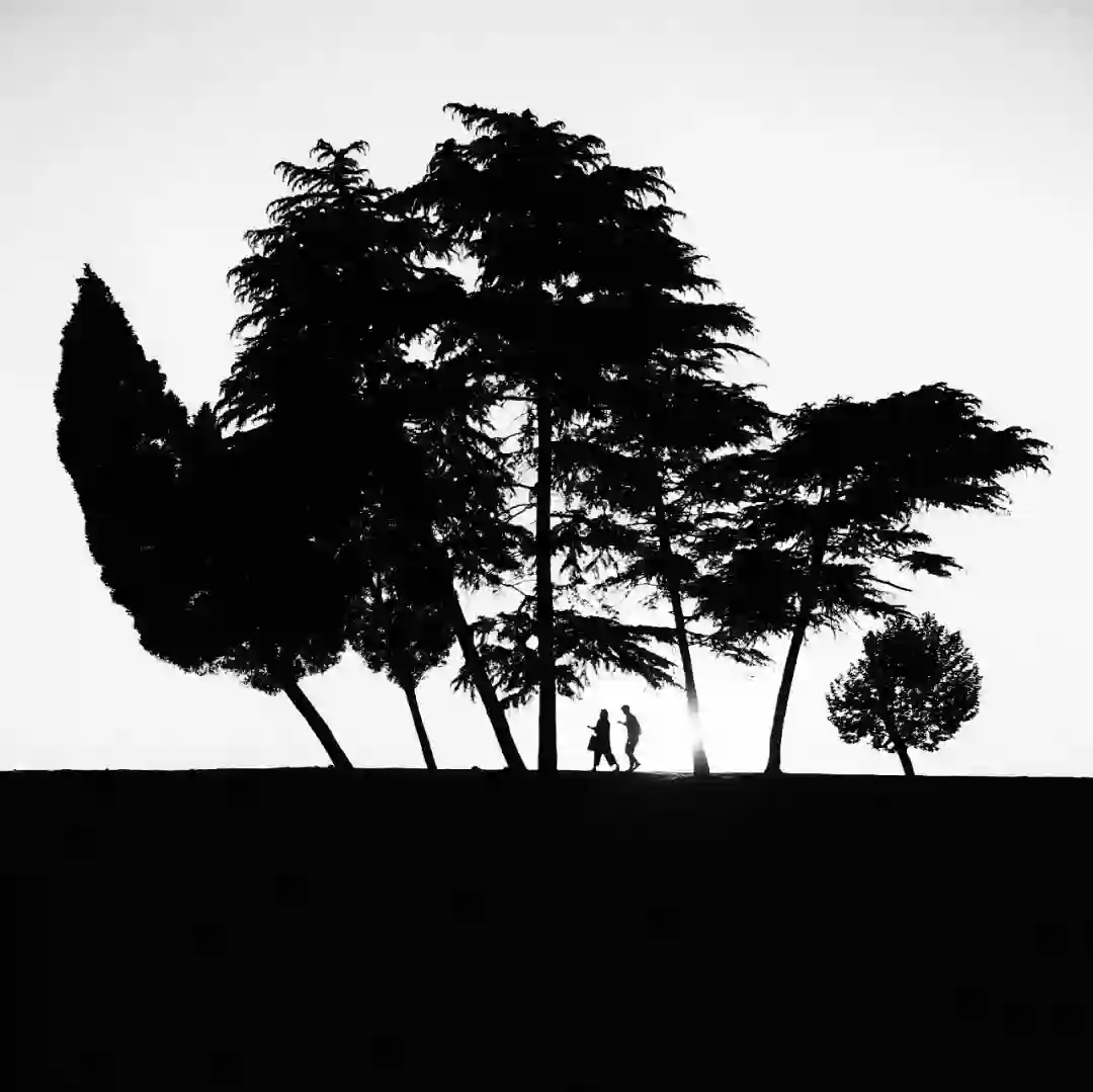 黄昏时分,在南京一个公园内,几棵错落有致的树在夕阳衬托下的剪影已然美丽,恰好一对情侣从树下走过,浪漫的一幕由此定格。