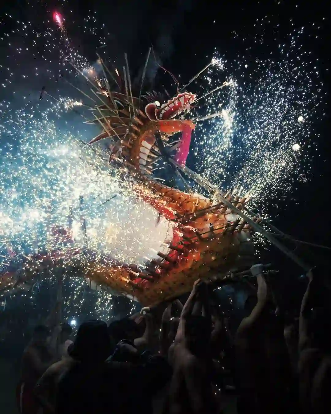 这张照片是使用 iPhone 6s 拍摄于元宵节晚上,中国广东省梅州市埔寨镇举行一年一度的舞火龙传统活动,这个活动至今已经有三百多年的历史。一条火龙由三十多名赤膊青壮年举起,跑动挥舞,火龙舞动的时候火花四射,烟花齐放,场面十分壮观。每当这天晚上,这里便吸引着成千上万的人前来观看,以祈求家人新的一年平平安安,身体健康。